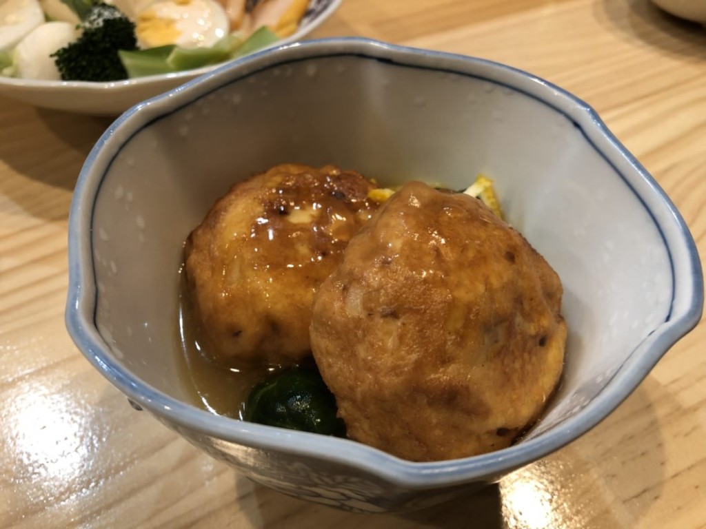 名物のコロッケは丸いフォルムにからしのちょっと効いたソースがおいしくって。中にはお雑魚入り。